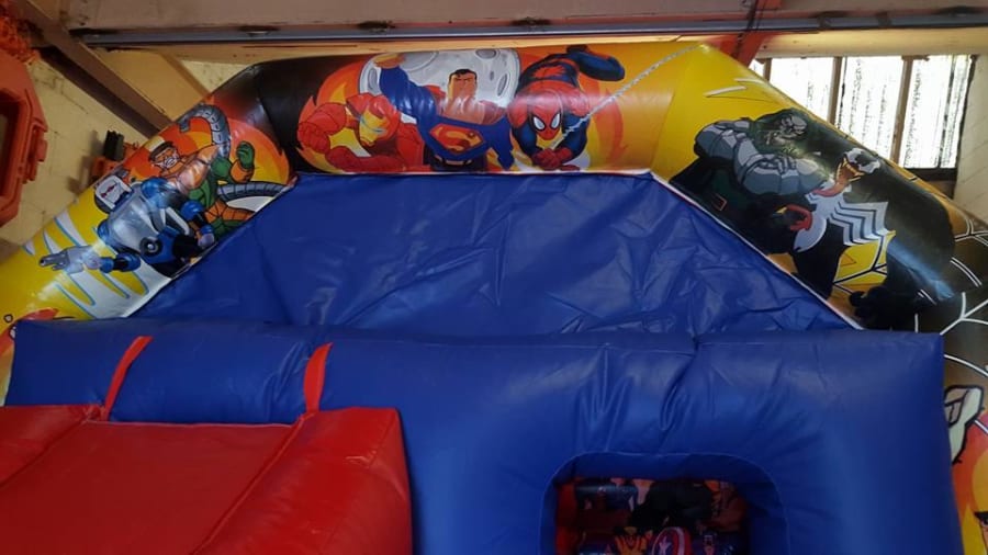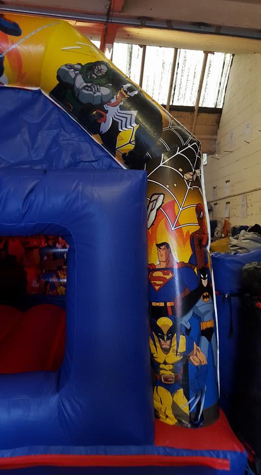Now available to hire here at bounce a lot northwest with this super hero combi castle in nice bright colours its perfect for any birthday or for and family party or any special events. Added to this castle is are extra safety feature of a full back wall to stop those little ones climbing over the walls. The castle also benefits from having a fitted shower cover to stop those showers spoiling your day.