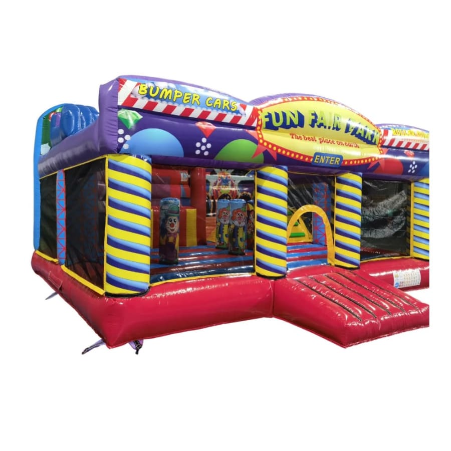 A giant bouncy castle full of activities and fun for users to engage in. This multiplay bouncer is ideal for areas with a lot of traffic of children who want to go on and have a variety of things to do. This large activity bouncy castle is in a fun fair design and includes activity items such as biff bash, slide, crawl throughs, hopping activities and bouncing space.