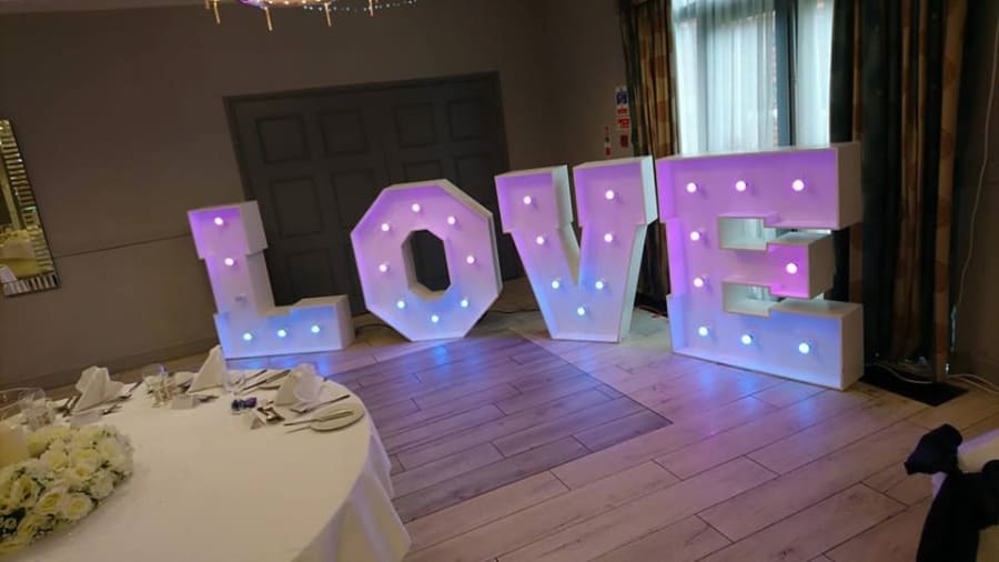 Hand made with detail to attention and available to light up your Wedding, Party or Prom in style. Our Illuminated light up letters and numbers are available to hire throughout the North west of England from For large packages we can deliver outside these areas but delivery costs would apply (please ask for a quotation). Standing at 5 foot high and finished in a white colour, the Illuminated Letters will add a special touch, a great lighting backdrop and fantastic photographic backdrop opportunities. With different styles of Illuminated LOVE letters, Initials, MR&MRS and numbers .